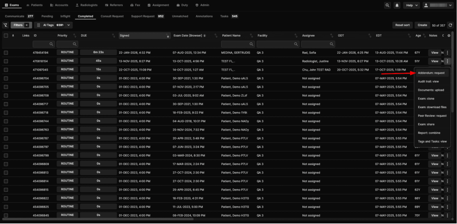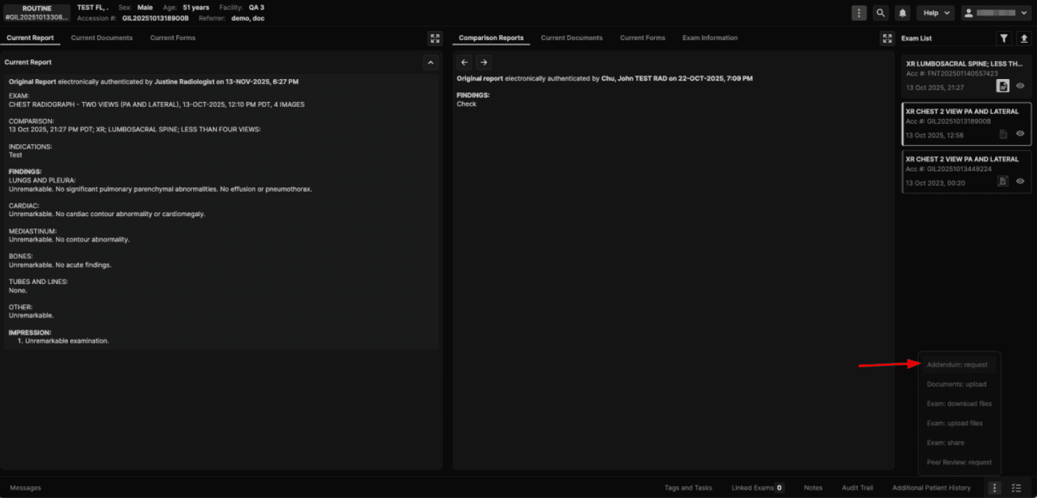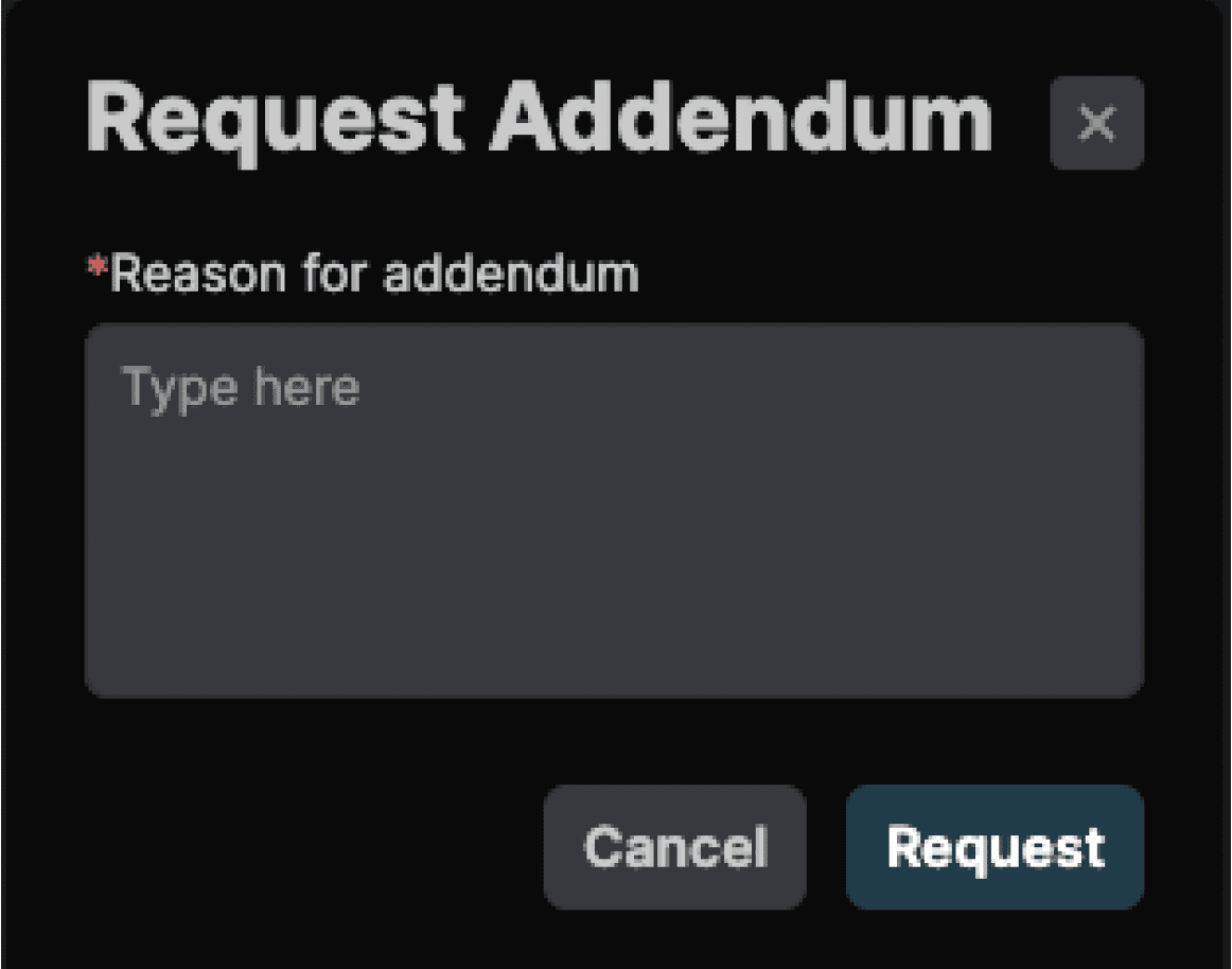 Enter the reason for the addendum and click Request to send the exam back to the Inflight queue. When a Completed exam (with “once signed” event, a final report signed in Synthesis, or an external report) is: