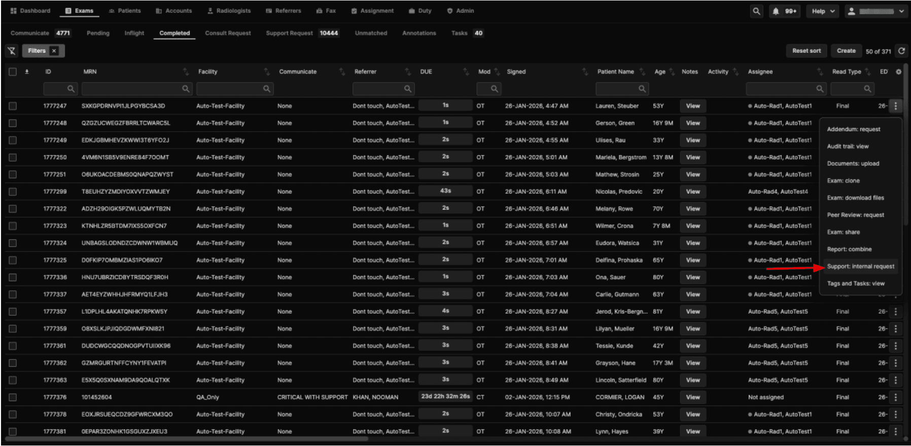 When a Completed exam has a final report (either signed in Synthesis or received as an external report) and changes are required, the exam may be sent to Support Request or an Addendum may be requested. Support Requests and Addendum Requests are permitted on Completed exams, including those that: |