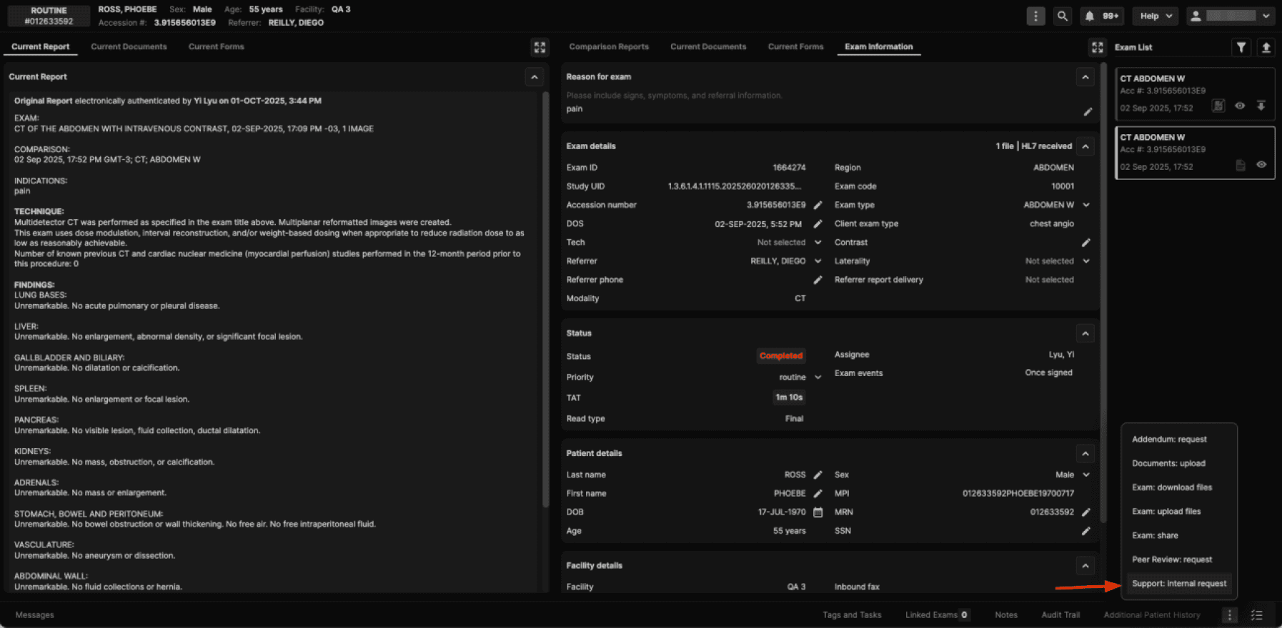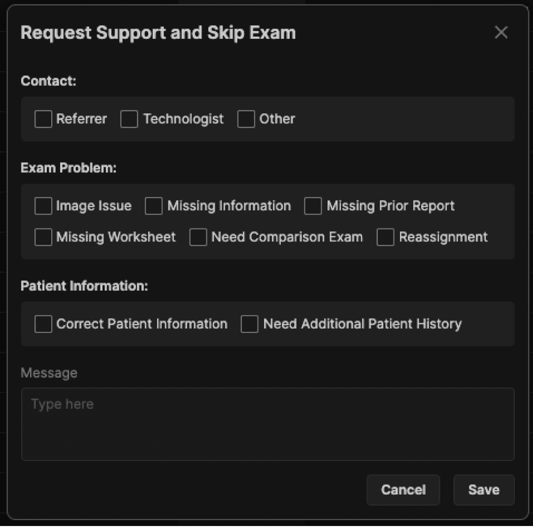 Select the appropriate option and click Save to send the exam to the Support Request queue. |