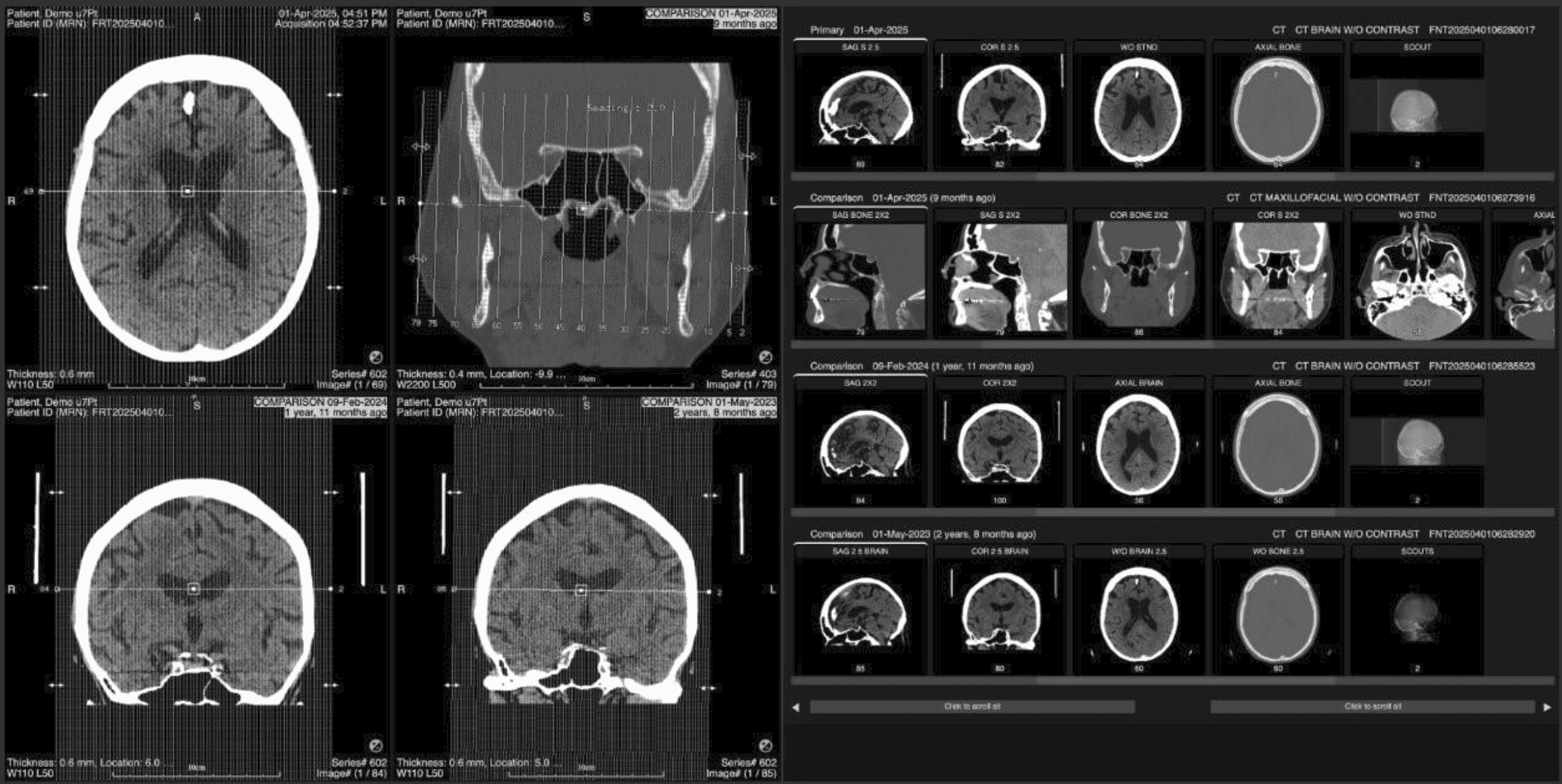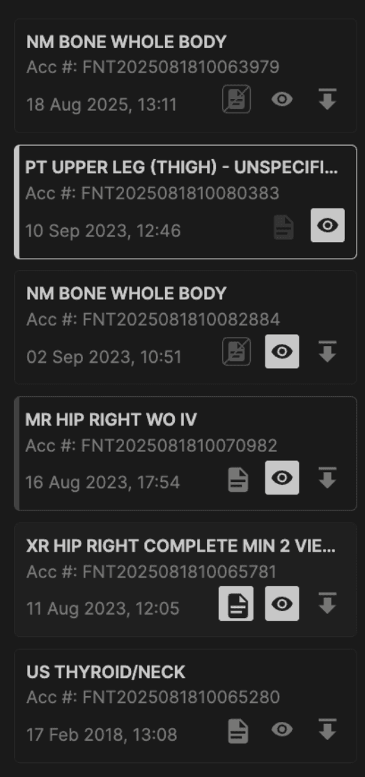 4. Load series into the viewports You can load images into the left viewports in two main ways: Drag and drop (custom layouts) Drag a thumbnail from any row onto a viewport. That viewport shows the selected series from that exam. Repeat in other viewports for any combination you need.