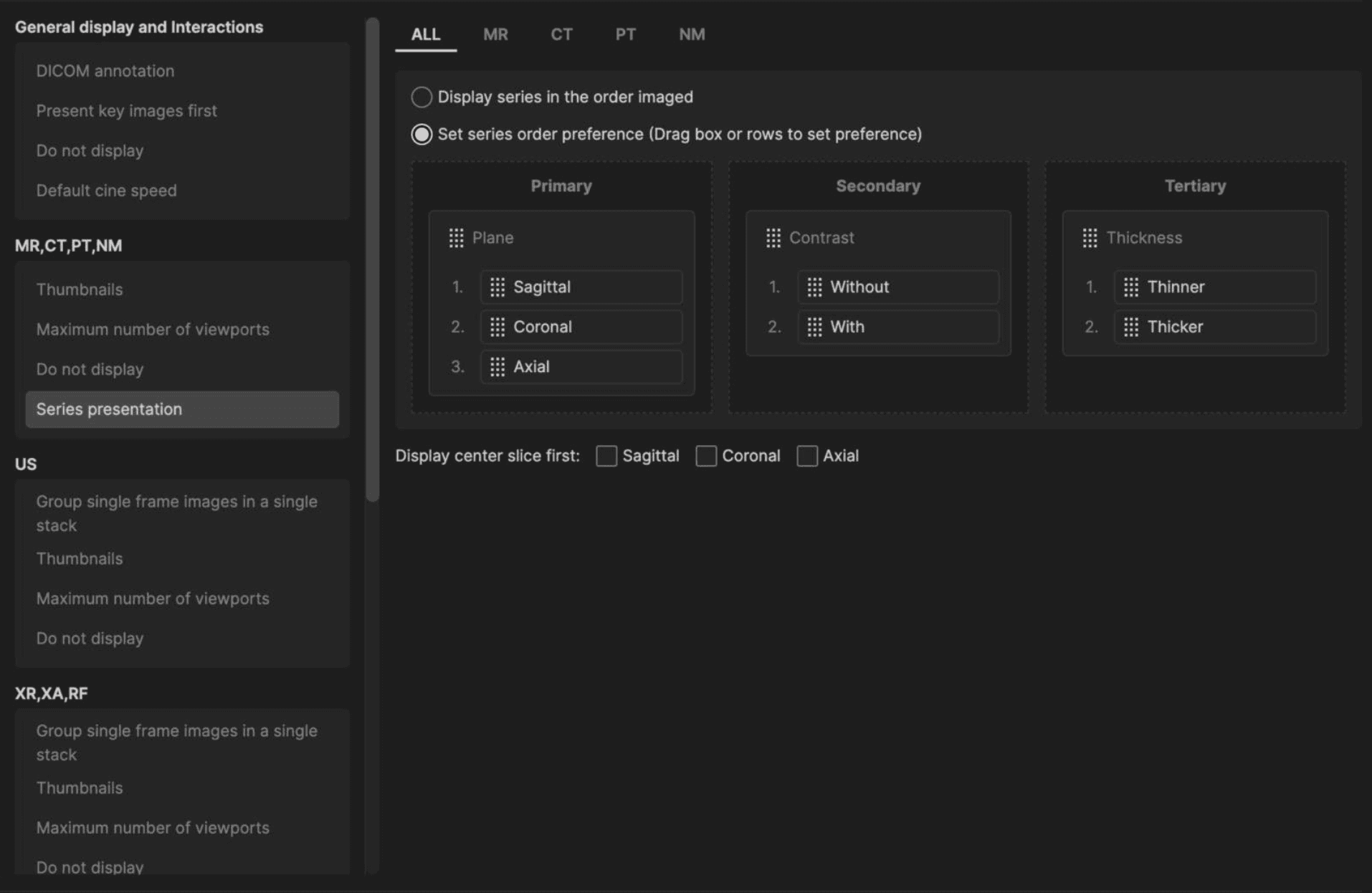 1. Set-up your Series Presentation hanging protocol Define the sort priority using drag-and-drop controls across primary, secondary, and tertiary levels. Organize series based on key attributes including: Plane (Axial, Sagittal, or Coronal) Contrast (With or Without) Slice Thickness (Thinner or Thicker)