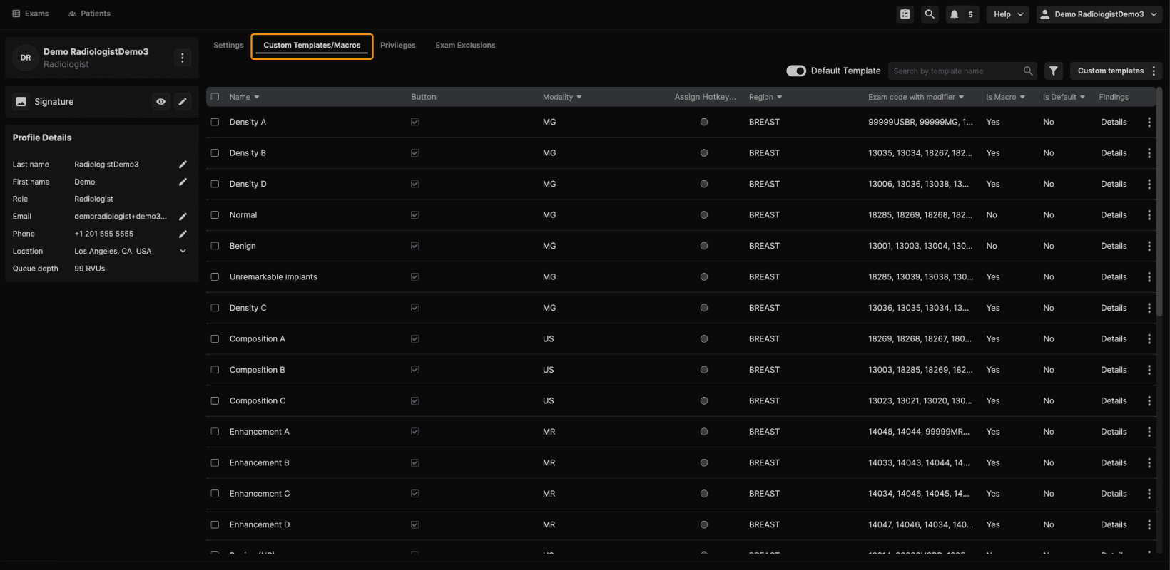 Step 1: Access Reading Physician–Level Templates To get started, log in as a reading physician and navigate to your Profile. From there, open Custom Templates and Macros. | |