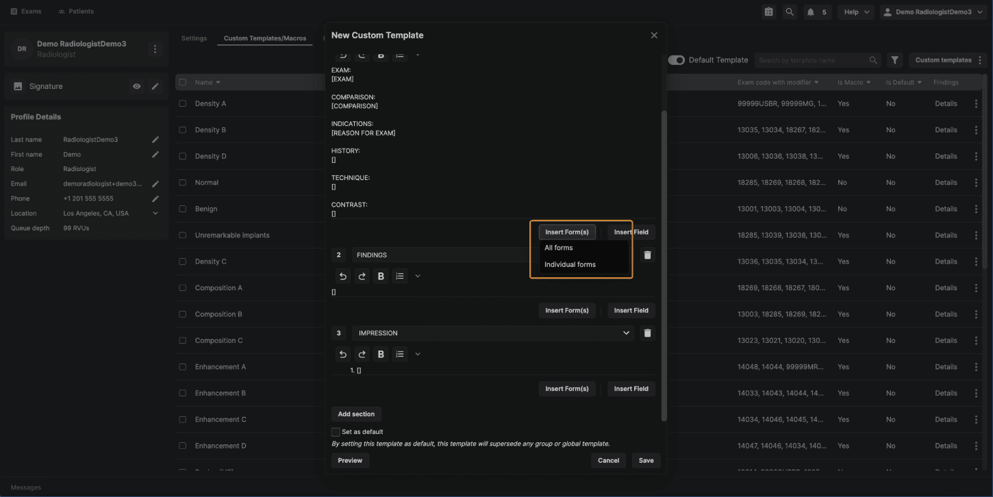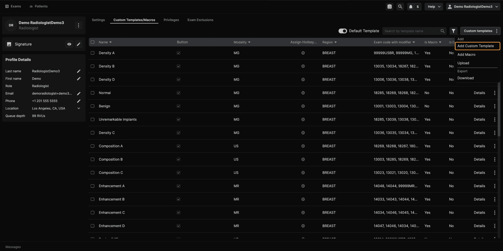 Step 1: Access Reading Physician–Level Templates To get started, log in as a reading physician and navigate to your Profile. From there, open Custom Templates and Macros. | |
