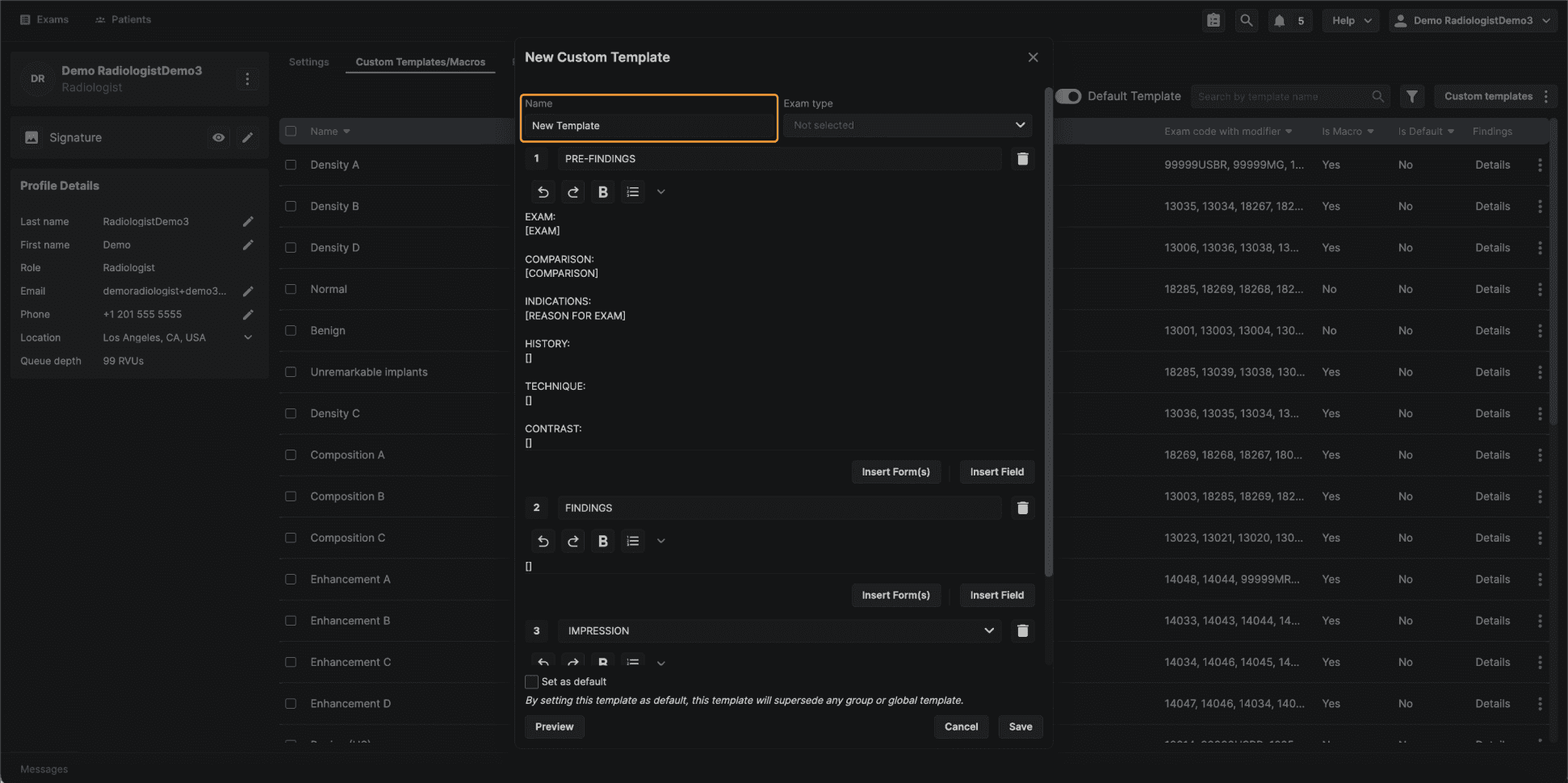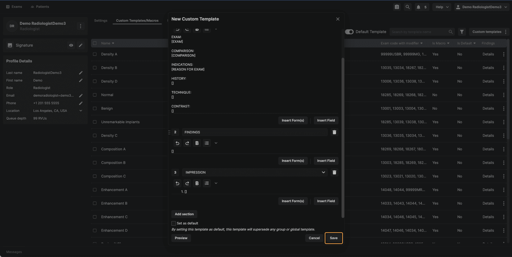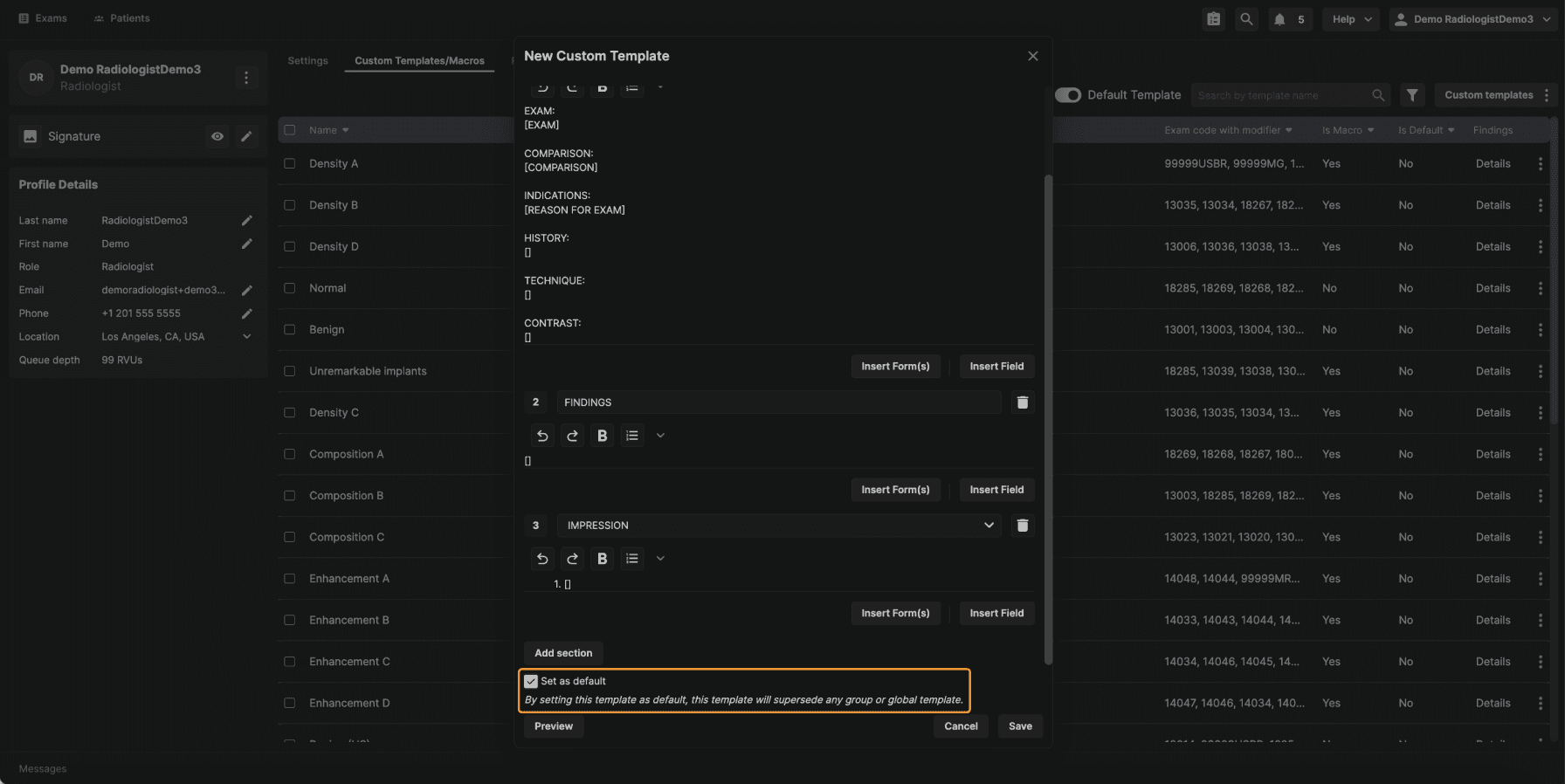 Step 6: (Optional) Set the Template as Default Reading physician–level templates include an option that is not available at other template levels: Set as Default.
