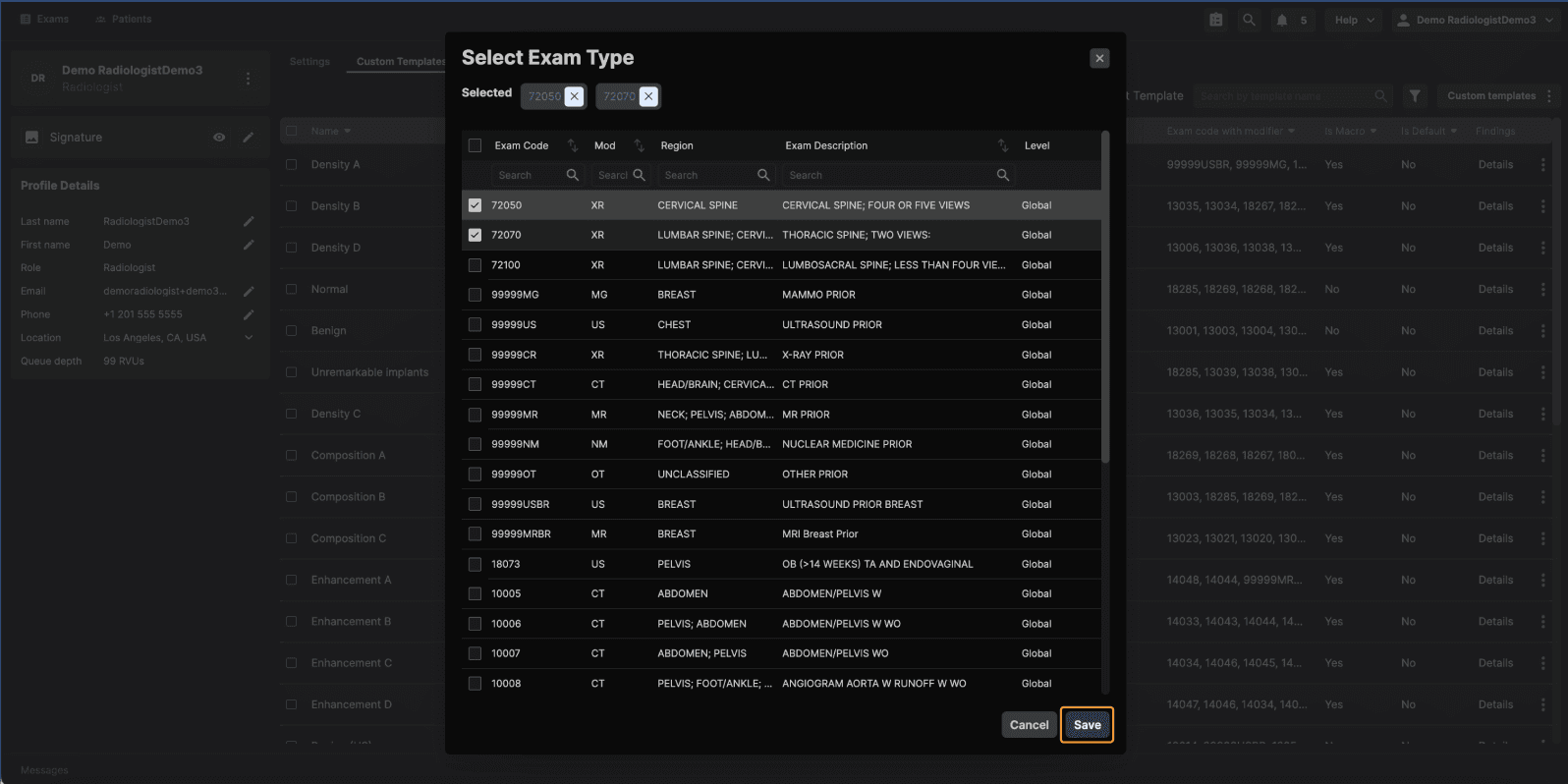 Once exam codes are selected, the template will be associated with those exam types. |