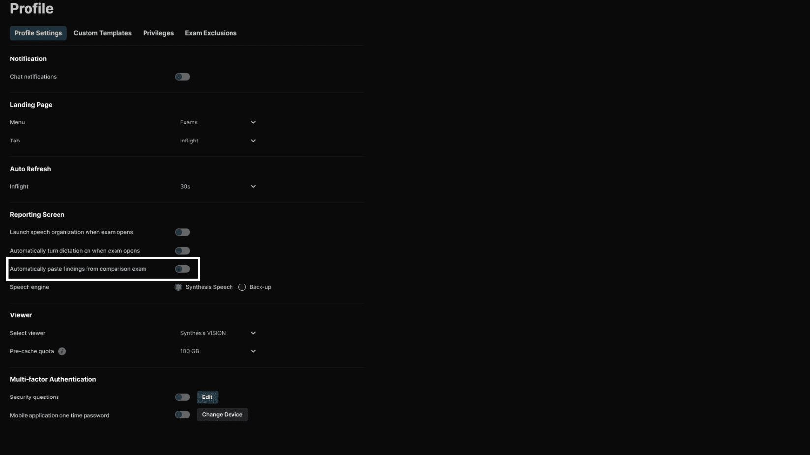 Access your profile to view this user preference. If enabled, the process of pasting prior findings will occur automatically for the most recent relevant comparison exam of the same modality as the current exam. If there is no comparison exam that meets this criteria, nothing is pasted. | |
