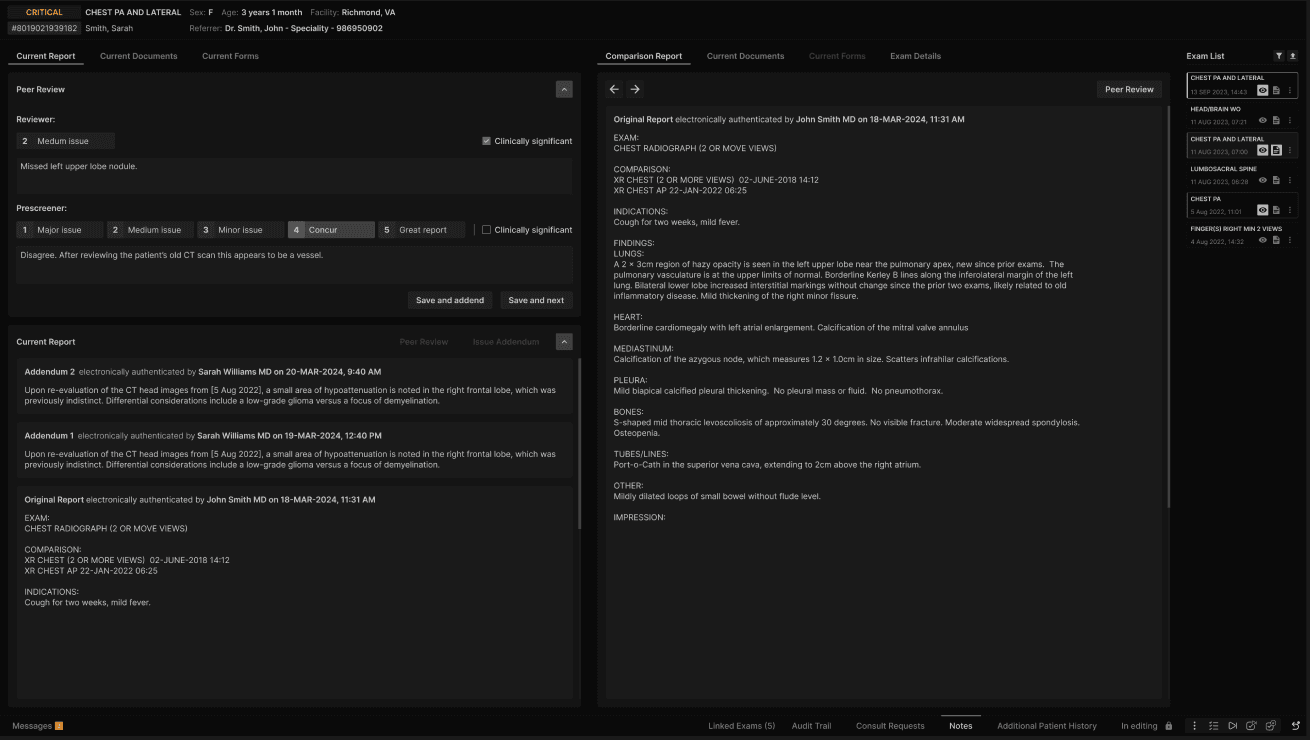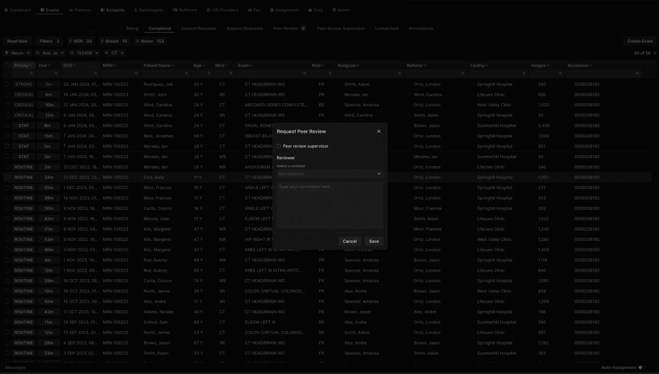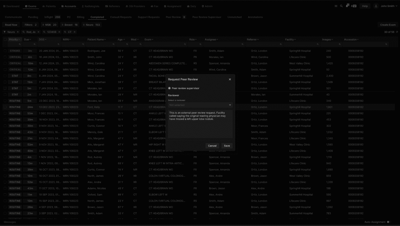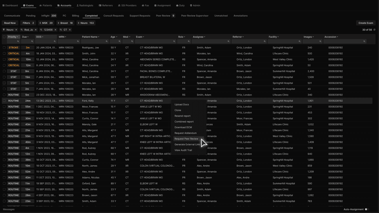 Any administrative or clinical user that has access to the “Completed” tab may receive and process a request for a Peer Review. Right click on the exam to access the menu and select "Request Peer Review." | |