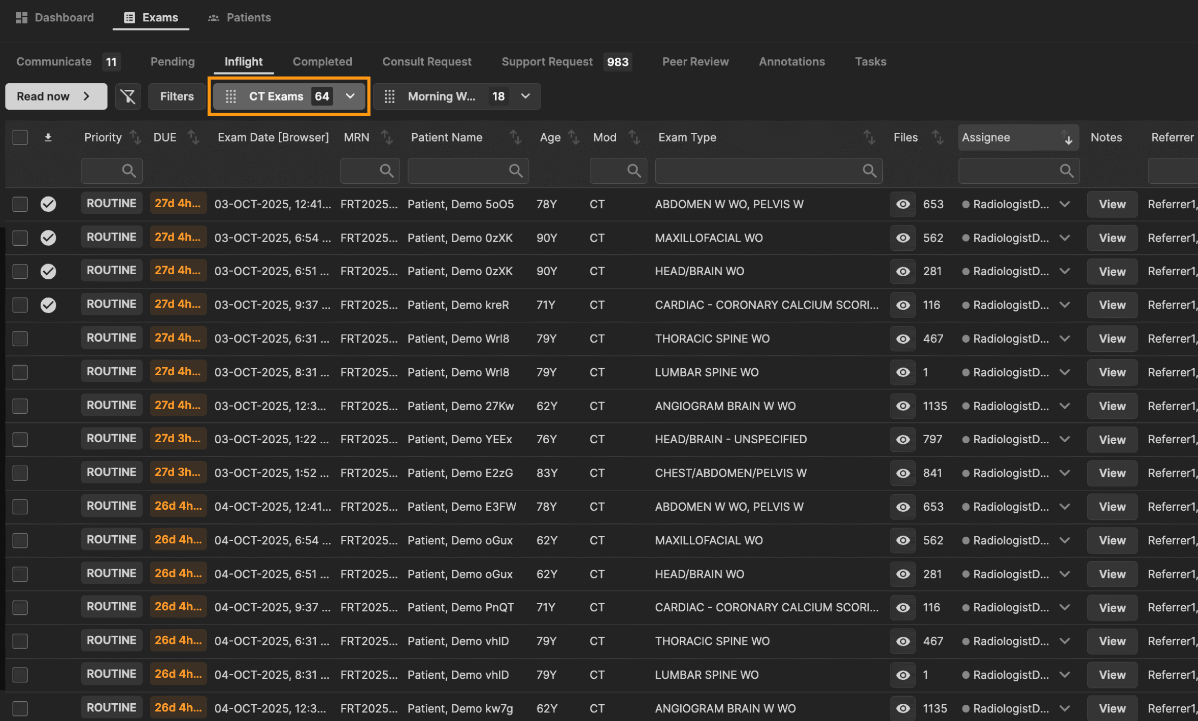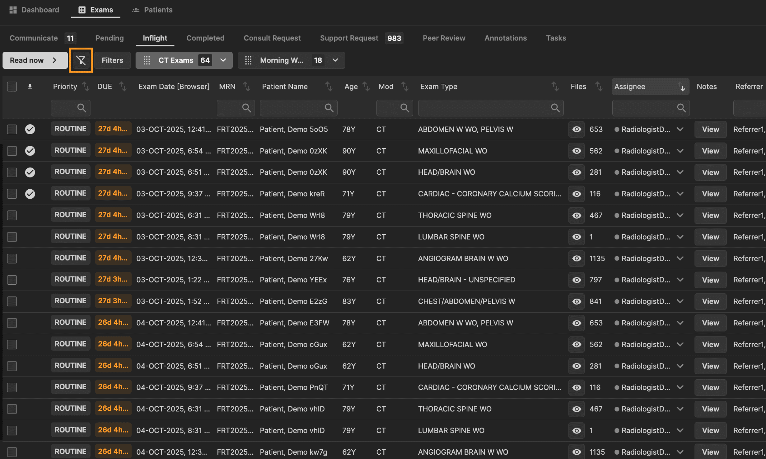 Click on a preset to apply it to your exam list. In this example, the "CT Exams" preset filter is applied.
