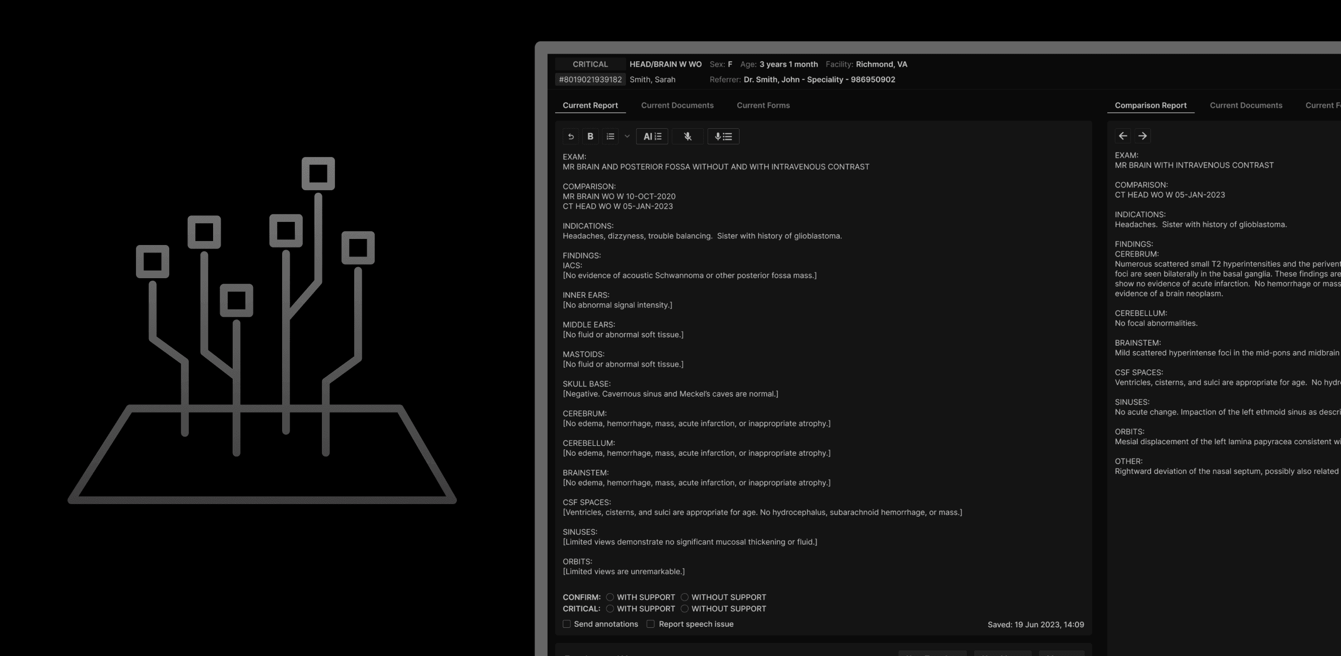 We believe that reading and reporting medical images are a unified cognitive process, so our technology enables reading physicians to focus on the images. | ||