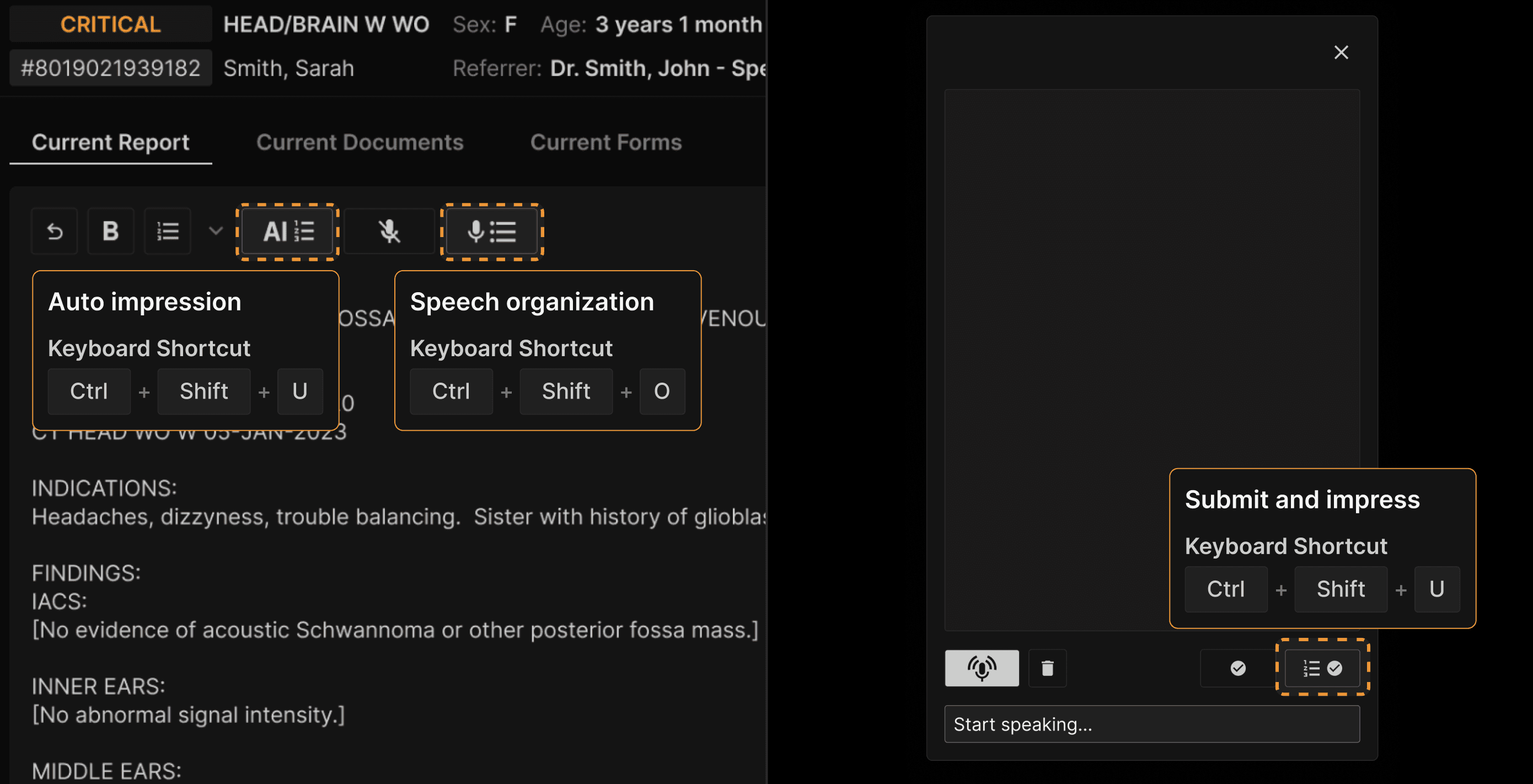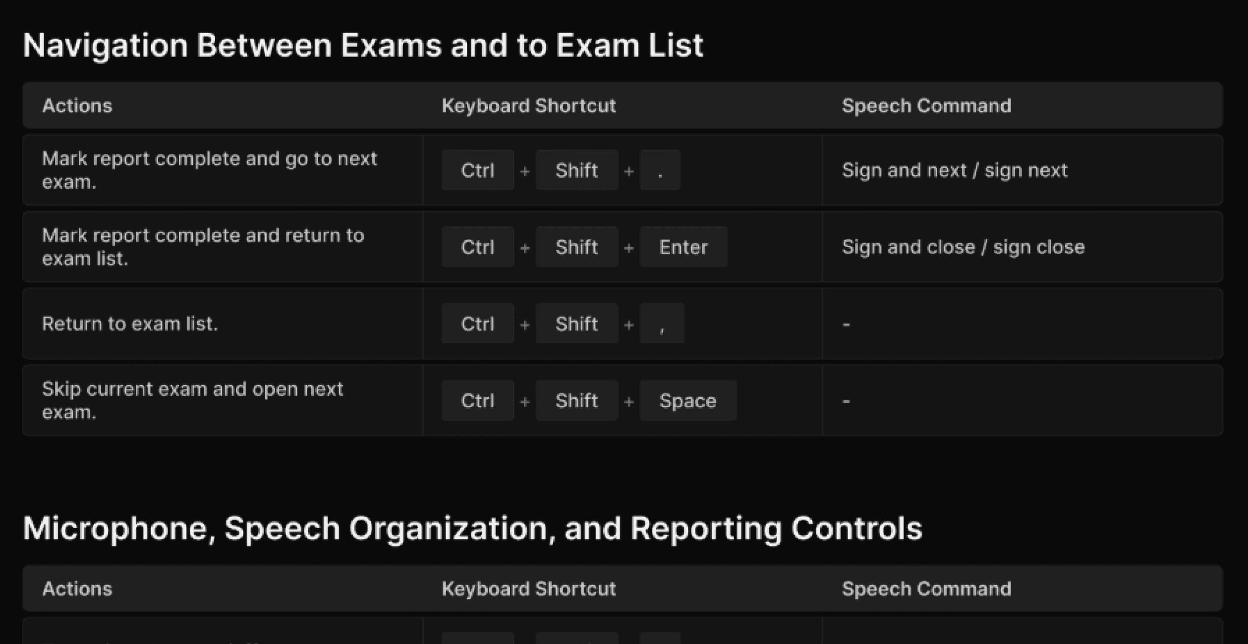 For reporting, use the Speech Organization and the Submit and Impress feature. Both can be initiated via keyboard shortcuts, and therefore configured as buttons on your mouse, hand-held microphone, or keypad. This makes for a disruptively faster way to report. If you find yourself dictating exam titles, comparisons, indications, techniques, radiation doses, measurements, breast histories, ultrasound technologist findings, interventional procedure supplies, or other such information, you have not optimized the configuration of the system. Of course you must carefully proofread your reports, but the system can automate almost all of the tedious, repetitive, and error-prone processes you have previously done. | ||
