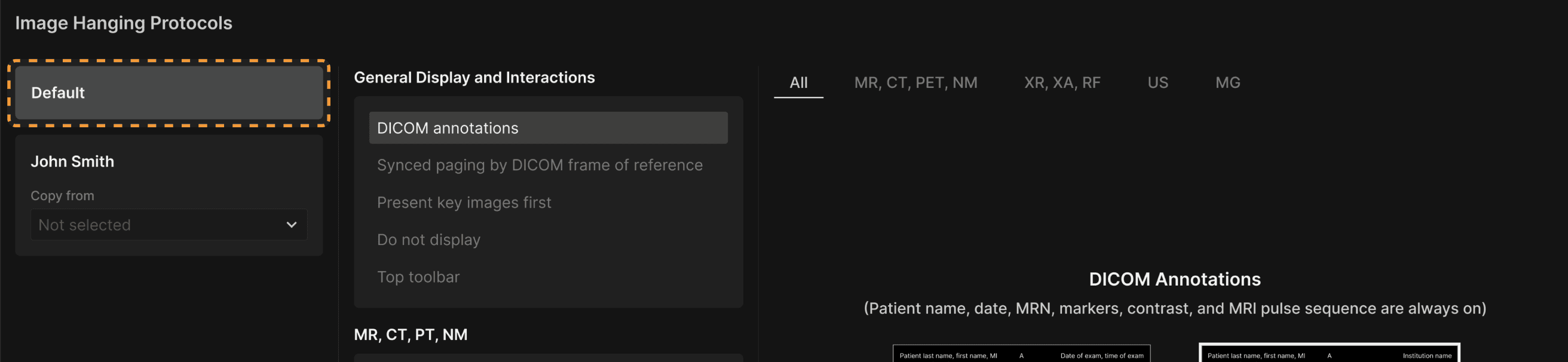 For viewing, most users are best off starting with the default hanging protocols. If you keep this option, when the system is updated, we will update your protocols to take advantage of new features. | ||