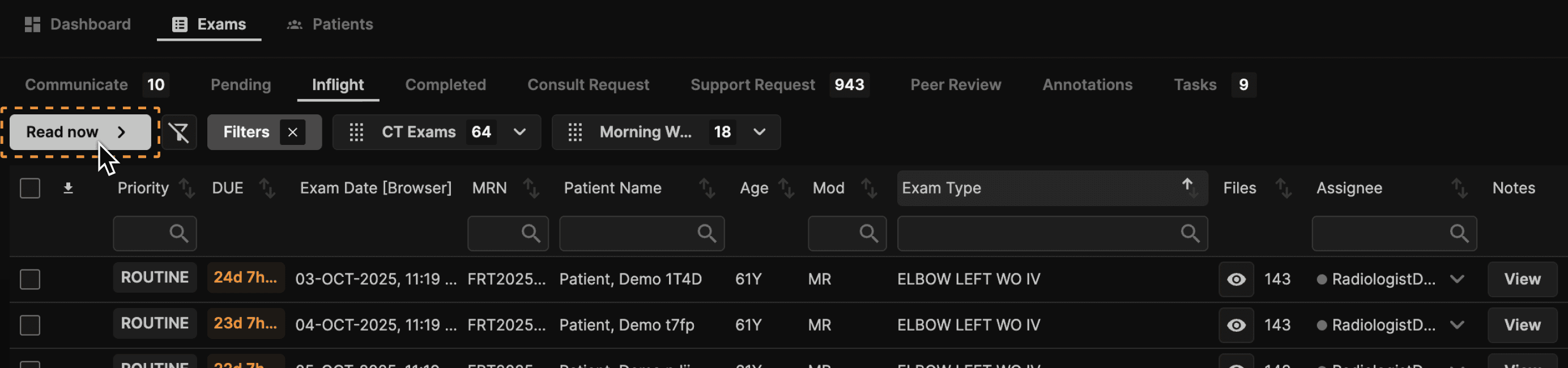 Once the list is filtered to your liking or even if it is unfiltered, the fastest way to read is to click READ NOW. The system will automatically present exams that are appropriate for you in a logical order based on priority and due time. | ||