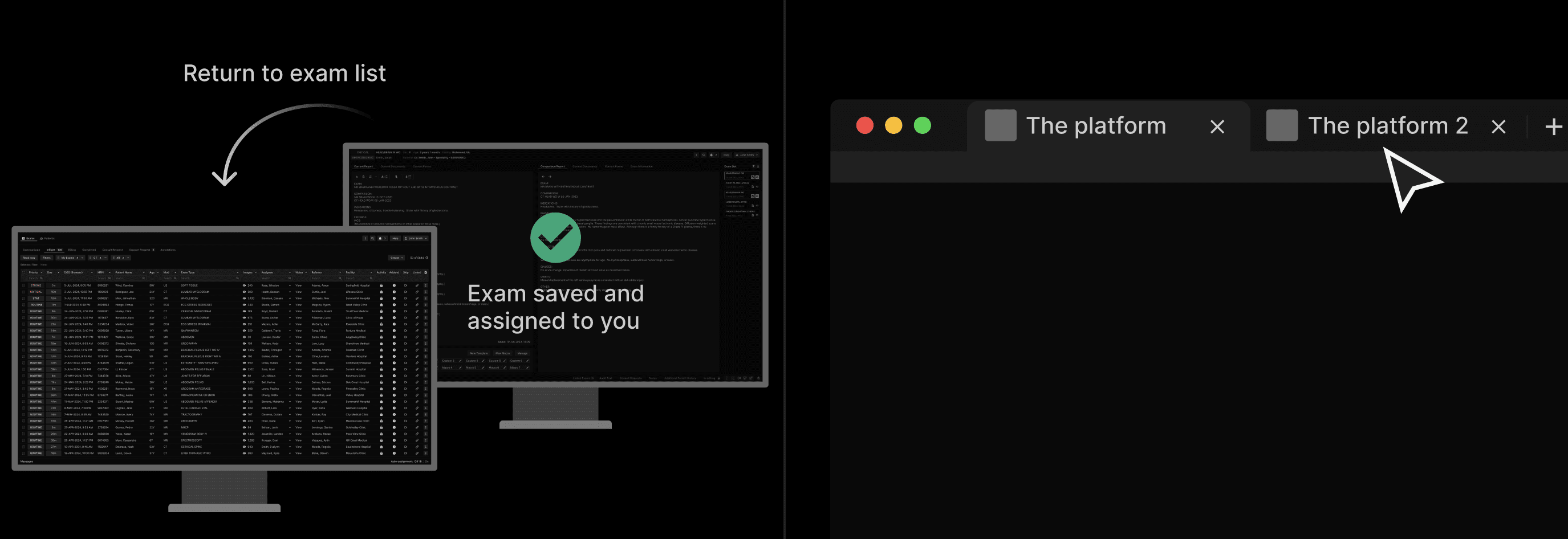 To handle interruptions, you may return to the exam list any time you are reading an exam. The system will save your report as you left it and the exam will be assigned to you if not already assigned. However, if you use this method, the image presentation will not be preserved as you left it. If you prefer, you may open another Chrome tab and launch another instance of the platform. Be careful, as always, if you take this approach, since you will be displaying two or more different patients’ images and reports at the same time. | ||