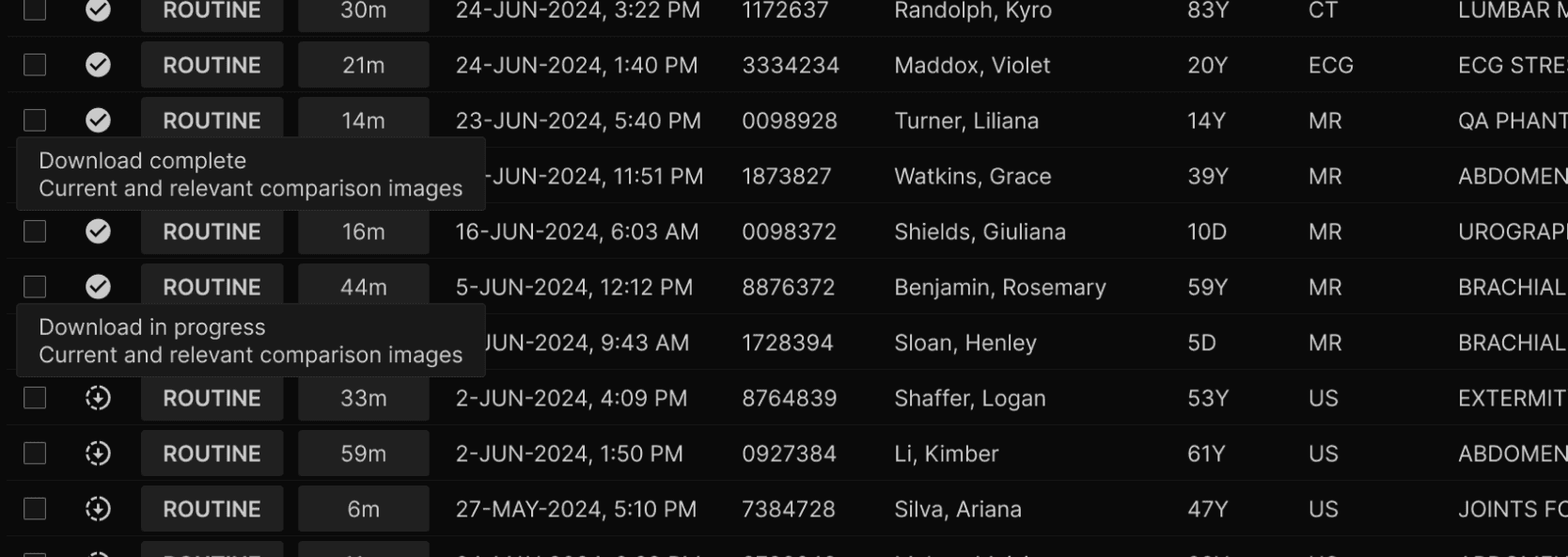 Assigned exams are automatically pre-cached to your local hard drive, making image display faster. You can also manually assign exams to yourself and manually request precaching for one or more exams. When exams are pre-cached, the relevant prior exams as determined by your group’s relevancy rules, are precached as well. | ||