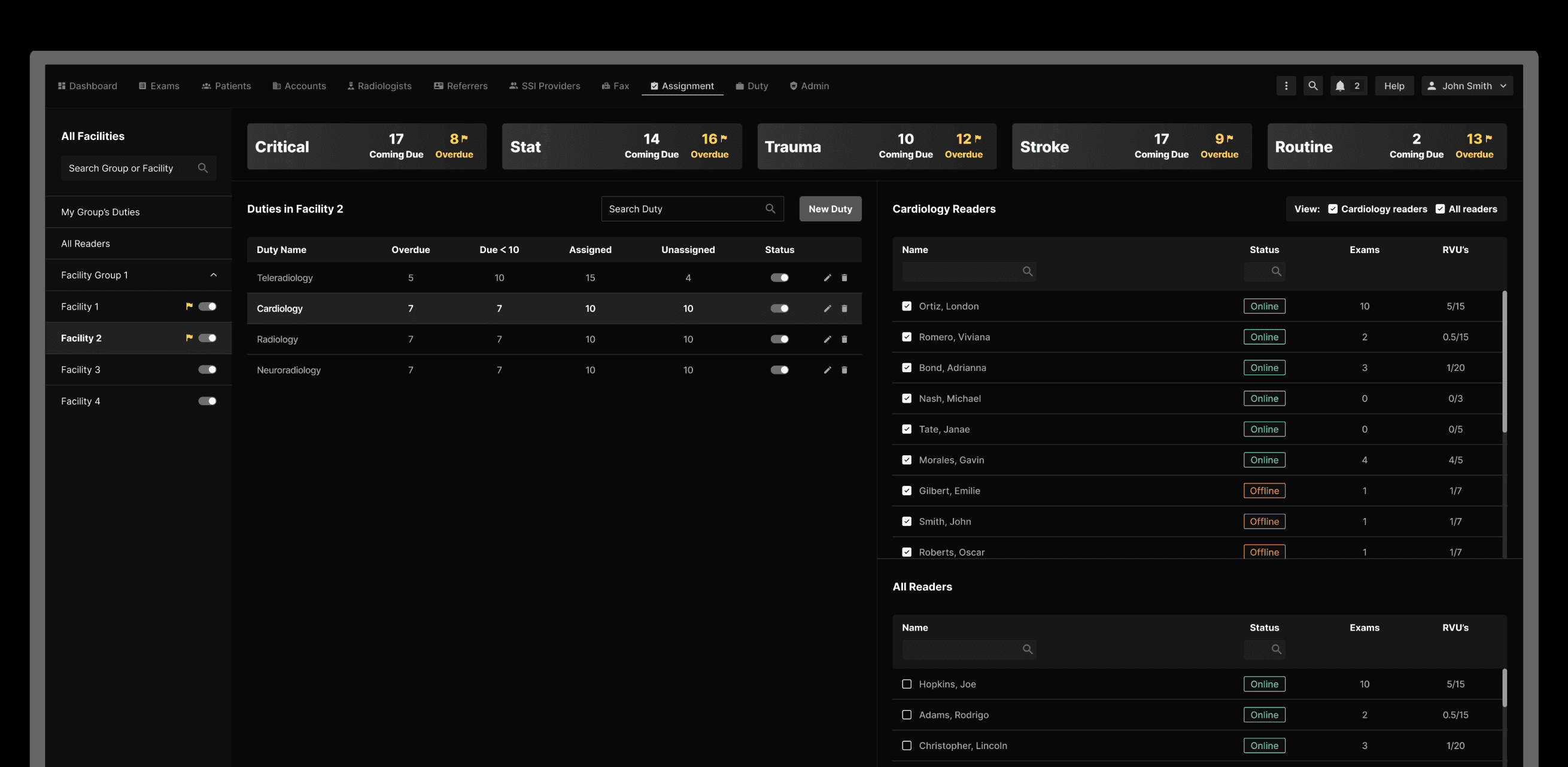 Take full advantage of the automated Duty Assignment features, which distribute work between reading physicians. The system can be configured so that a physician can read unassigned exams, assigned exams, or a combination thereof. | ||