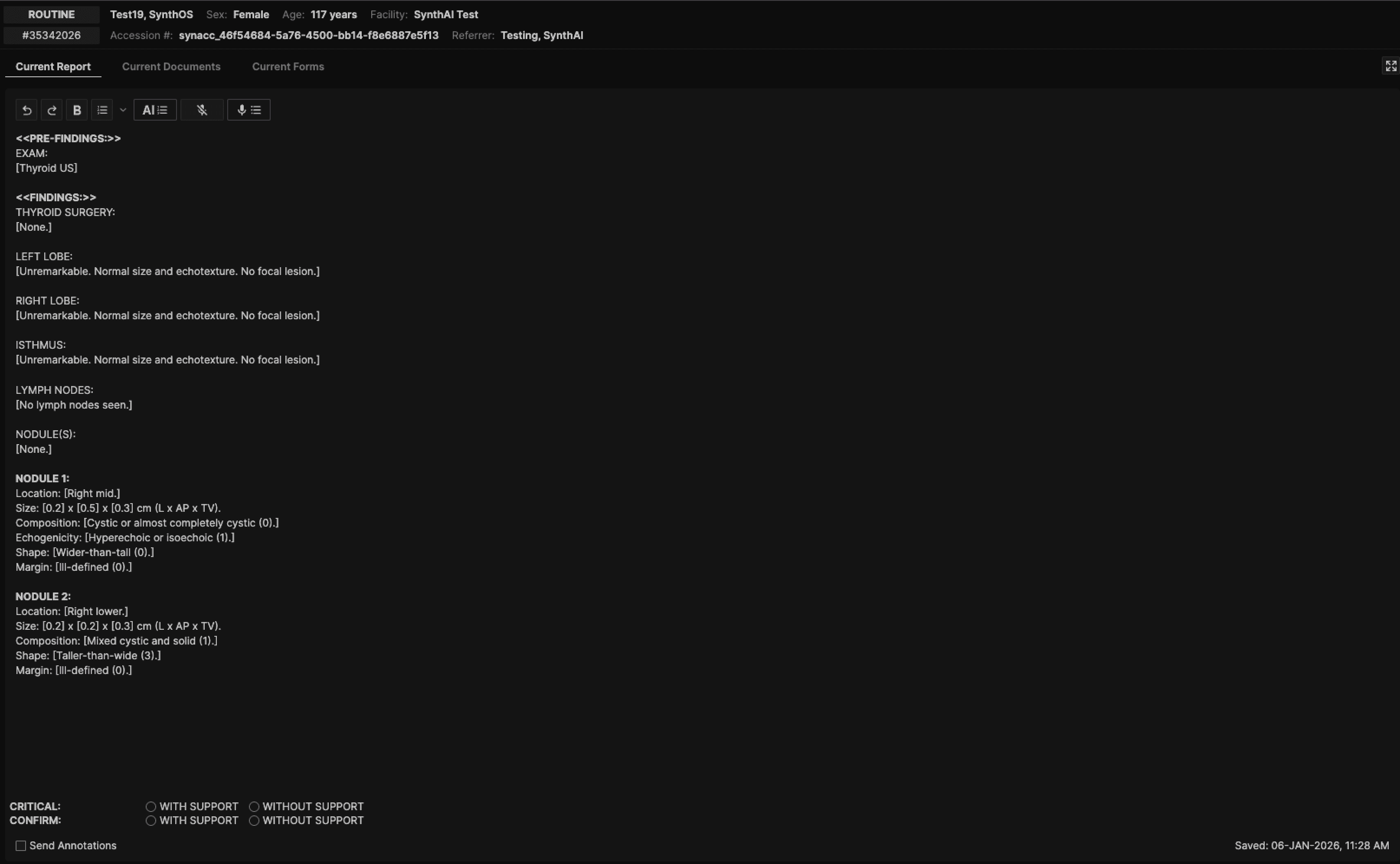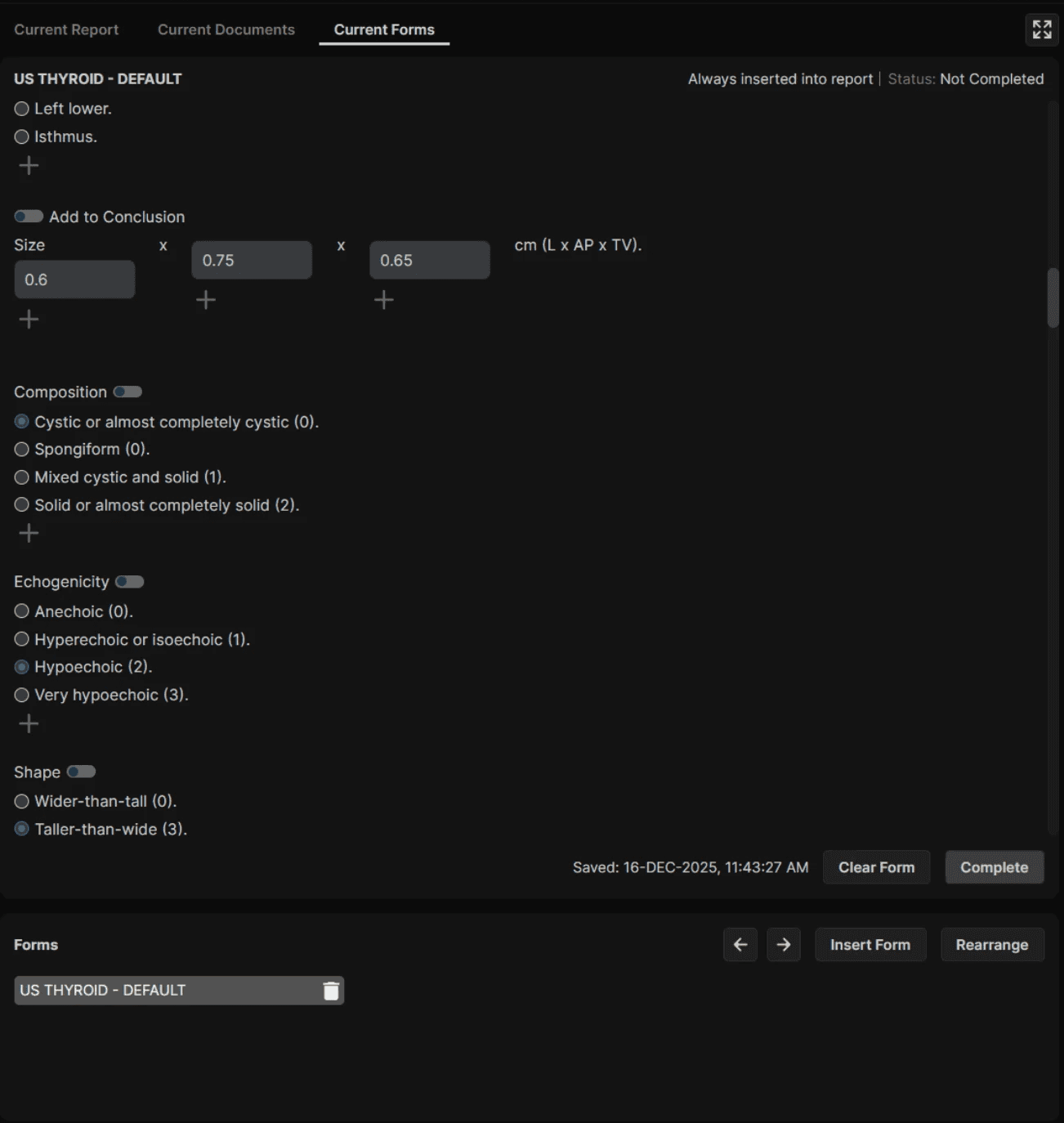 Report Assistant 3.4 introduces Thyroid Reporting 1.0, enabling structured thyroid reporting with TI-RADs score calculation and management follow-up, all from within Report Assistant. The system uses data entered in the US Thyroid form to automatically generate the Assessment and Recommendations and Impression sections. | ||||||||||