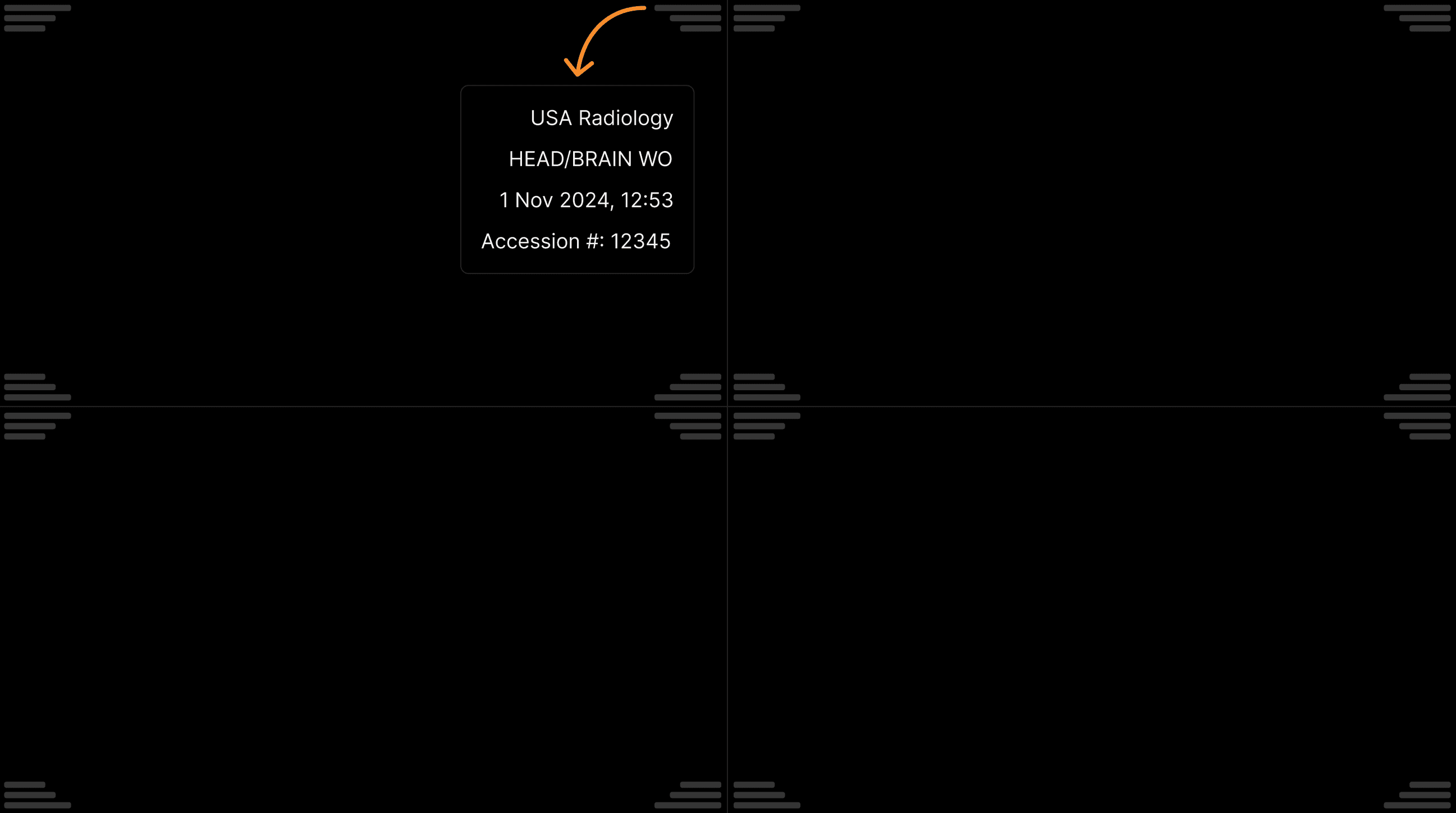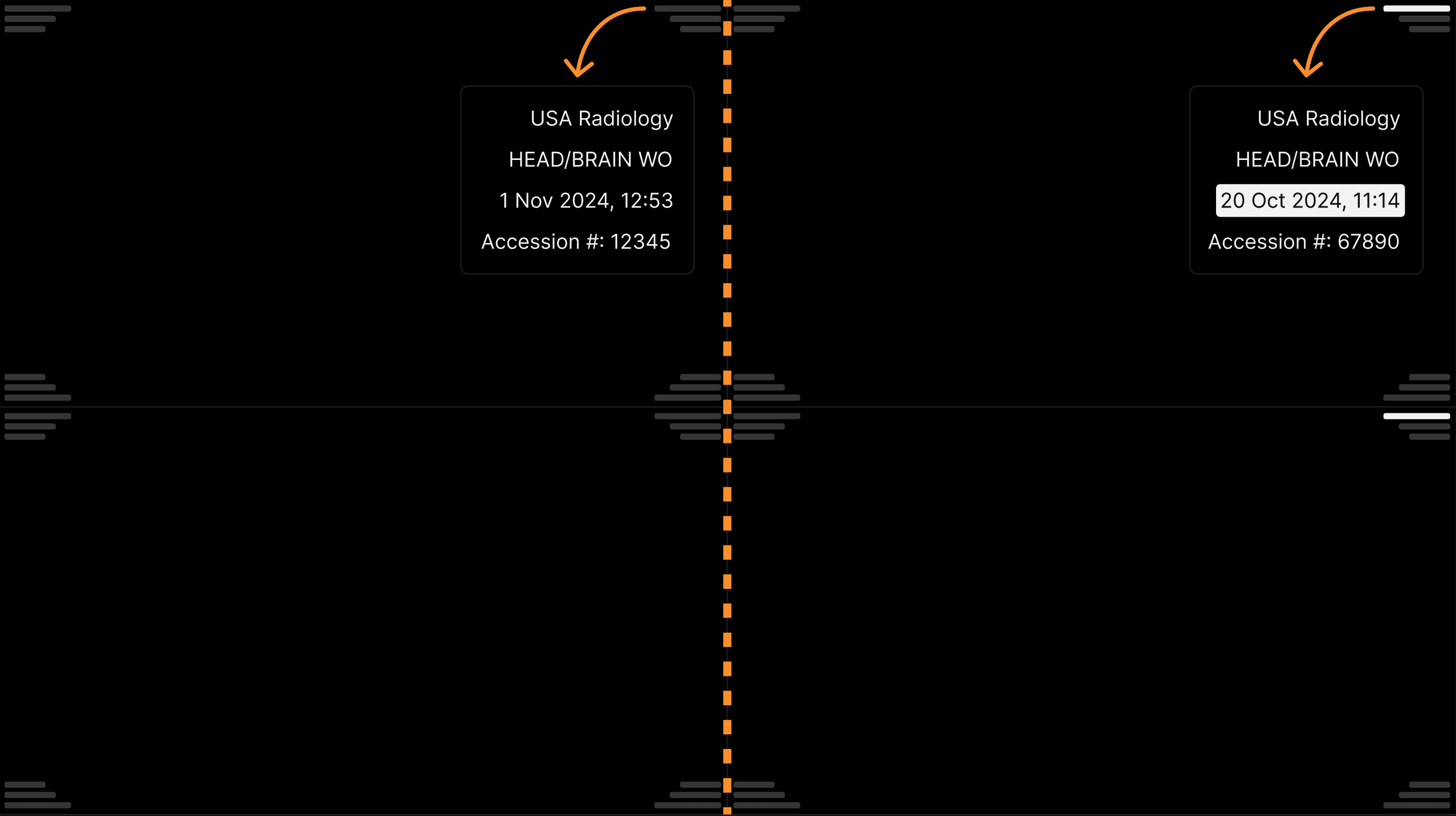 Displaying two exams (current and comparison exams).The left panel shows the current exam and the right panel the comparison exam. Comparison exam image series will always have the date displayed with a white background for a quick understanding of what viewports belong the the current and comparison exams. | |