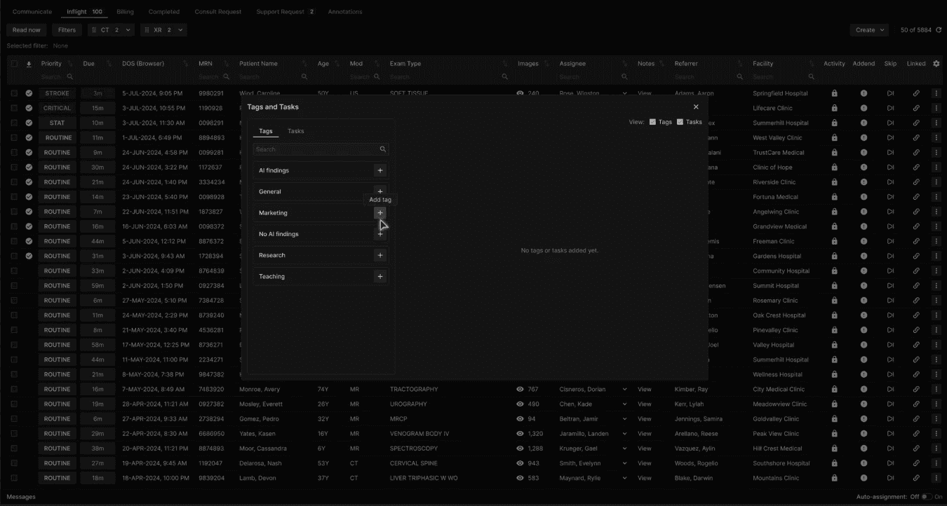 An exam may have one or more Tags and Tasks, each appearing at the right side of the Tags and Tasks dialog. The more recent Tag or Task appears on top. | |