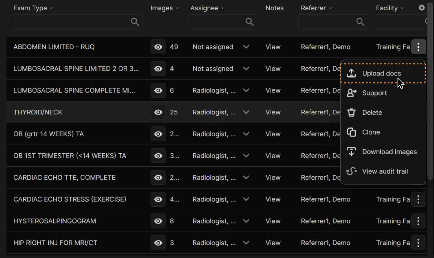 Click the three dots at the right of an exam and select ‘Upload docs.’