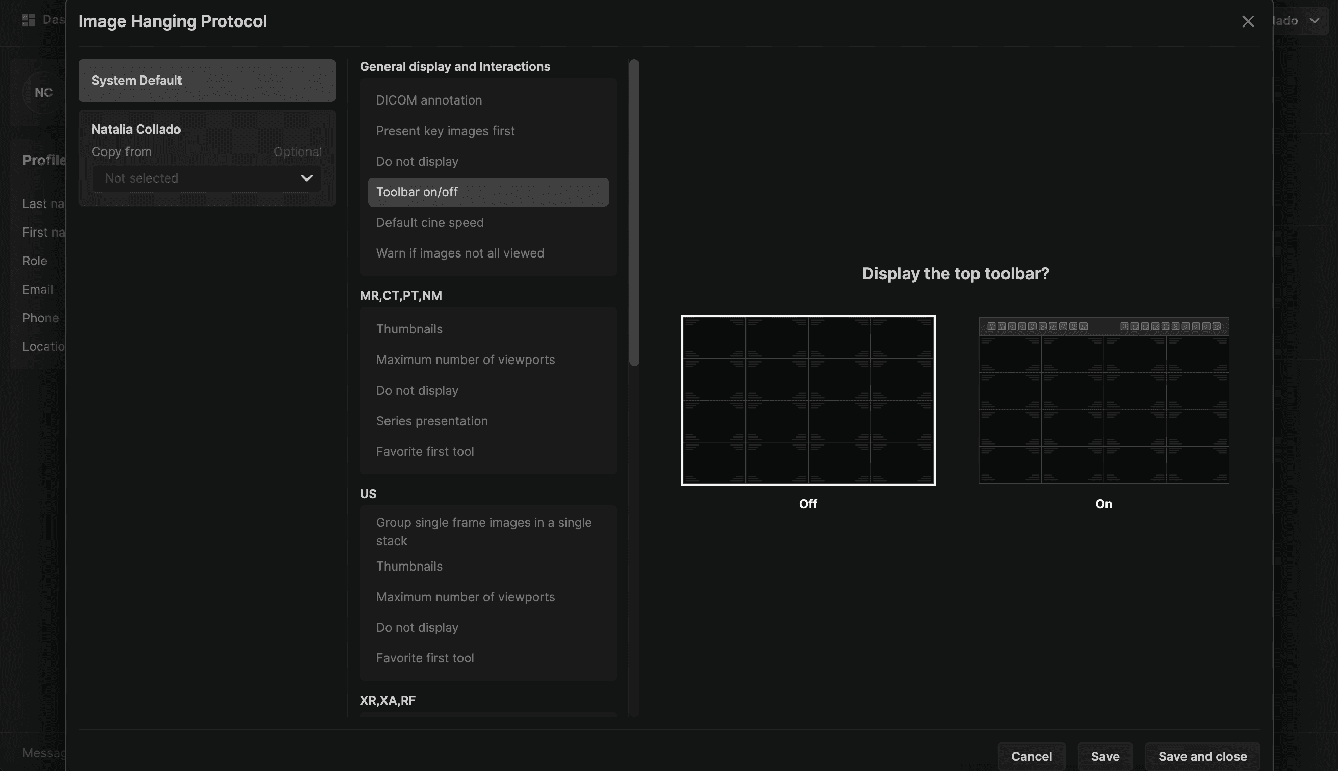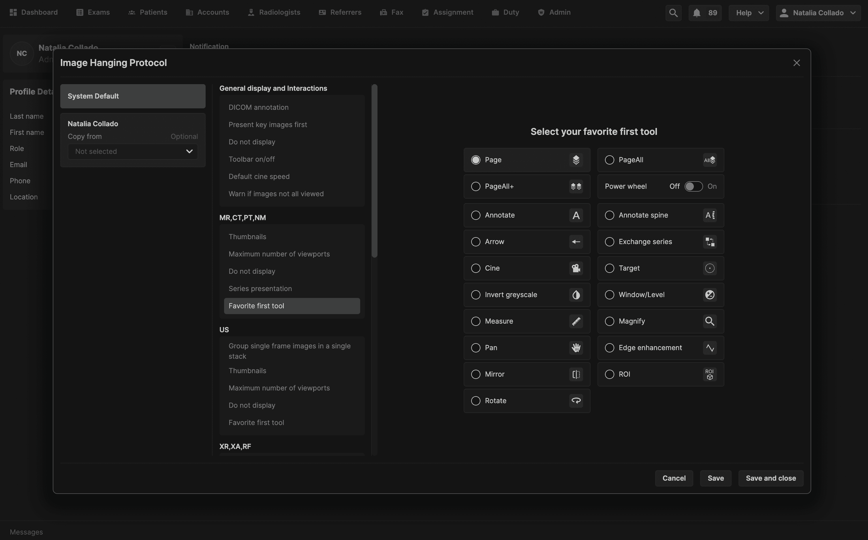 With the new hanging protocol, users have the option of selecting which tool is activated per modality by default when an exam is opened in the viewer. This helps streamline the workflow and ensures the user's preferred tool is always ready for use. If you have not selected a favorite tool, the default is the Page tool. Users also have the option to have the power wheel on or off when accessed. | ||
