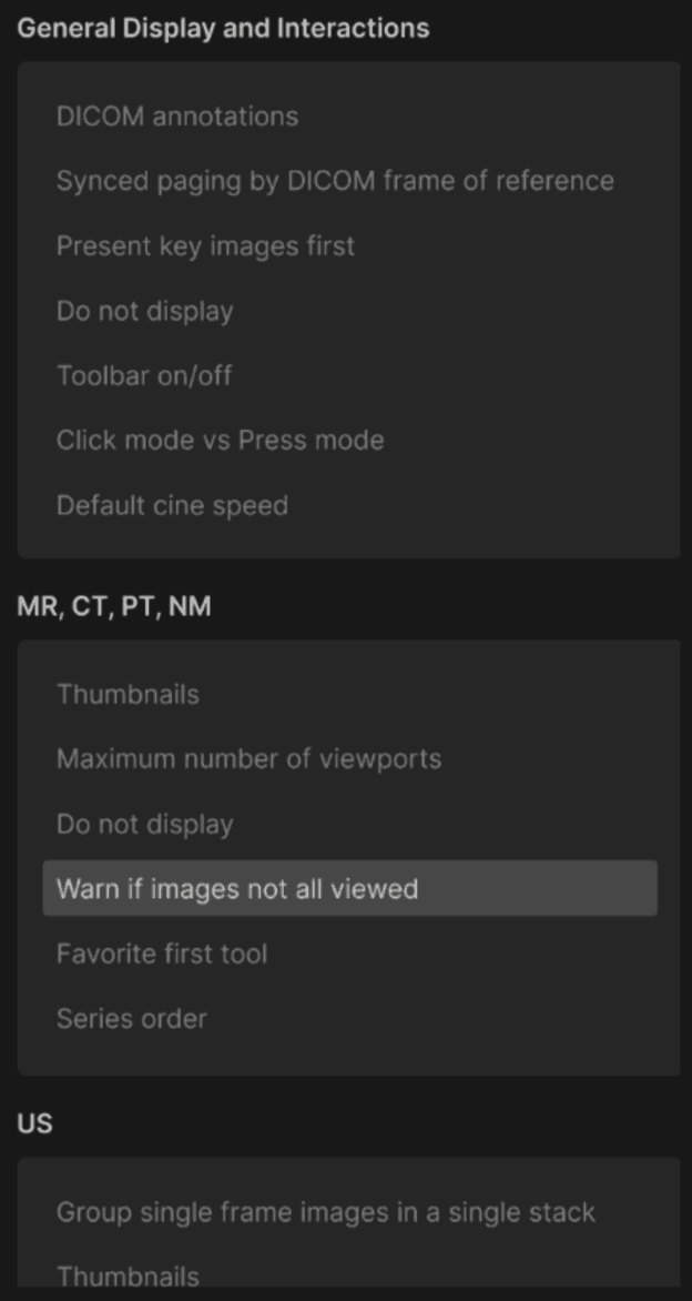 A warning message now indicates whether all images have not been viewed when an exam is marked as read. The user may configure this message off. | ||