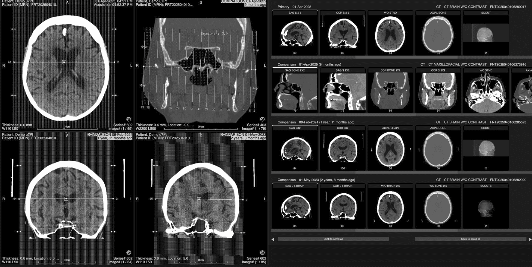 Compare Mode lets you review the current study with up to three prior studies in a single view.
