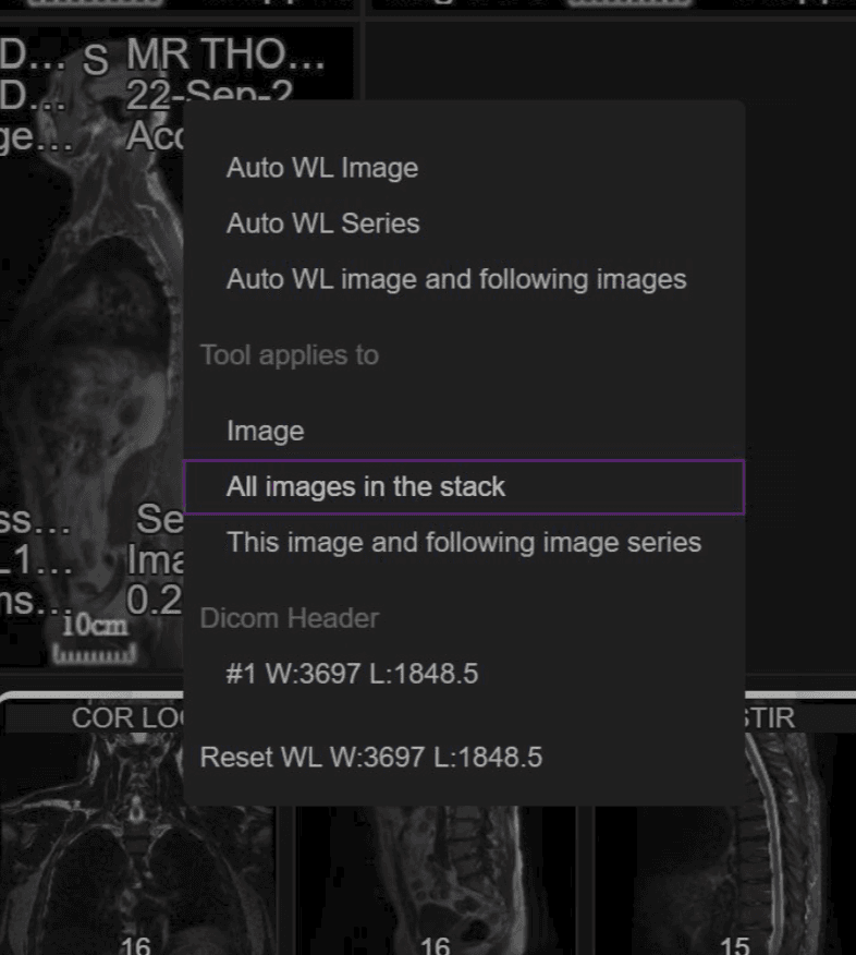 Manual Window Level (W/L) now allows you to adjust the W/L for a single image or multiple images at once with MR exams. Keyboard shortcuts let you change the window level much faster. | ||