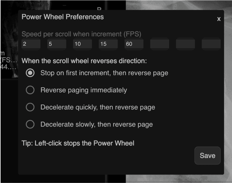 Users can now customize Power Wheel behavior — including scroll speed increments and direction reversal mode — and save their preferences for persistent use across sessions. |