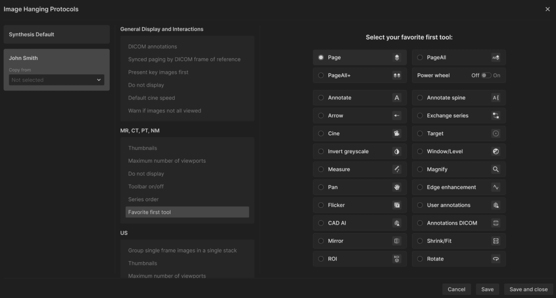 A user can now choose a default “favorite first tool” for each modality (CT, MR, PT, etc.) within Hanging Protocols.