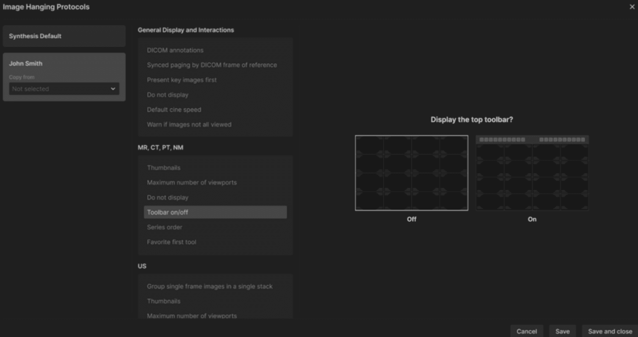 A user can now control whether the top viewer toolbar is displayed or hidden. A new “Toolbar on/off” option has been added under General Display & Interactions in Hanging Protocols.