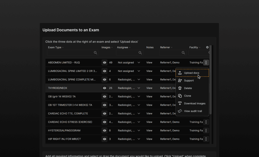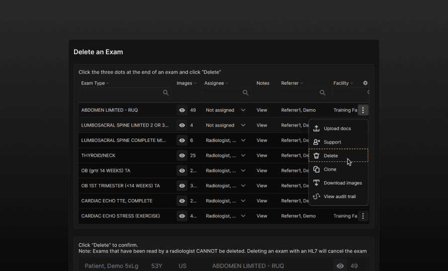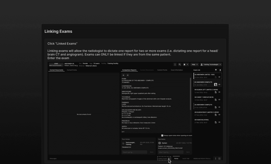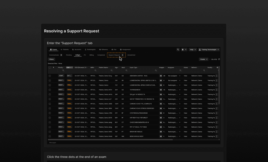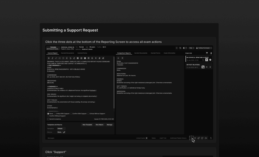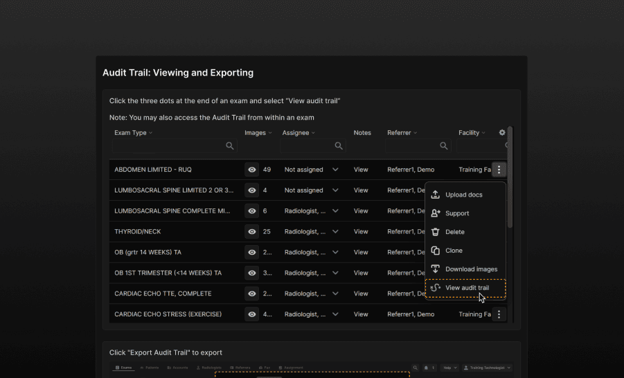 Provides instructions on audit trails, support requests, exam management, and form handling.